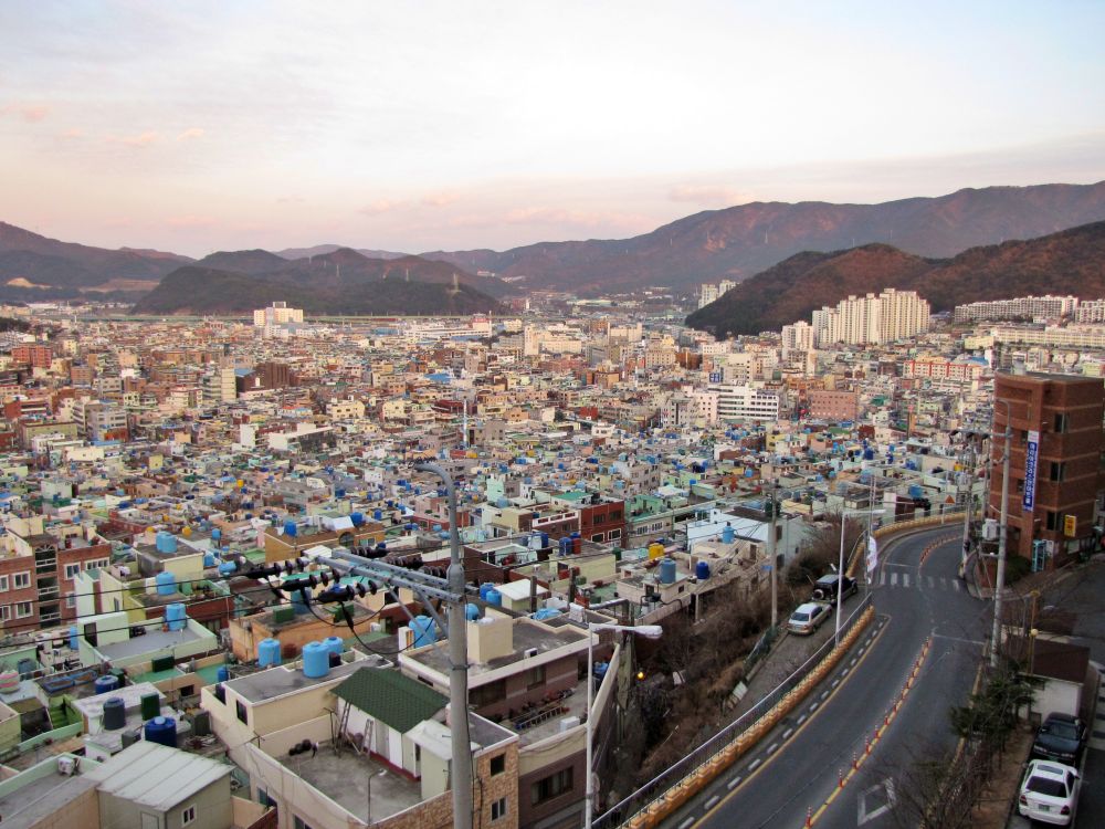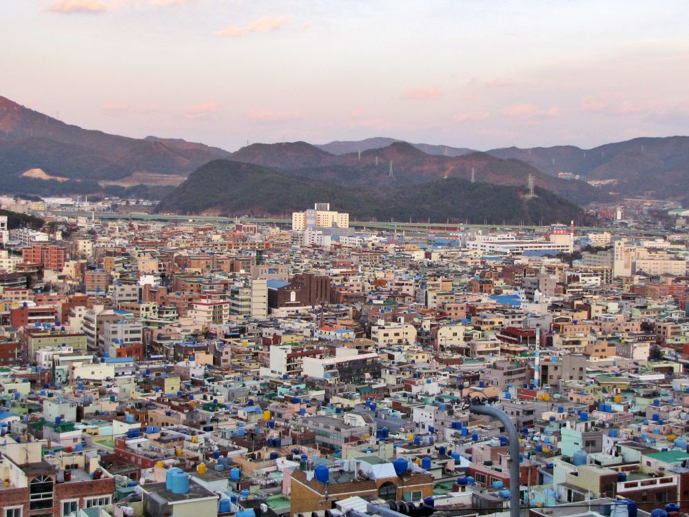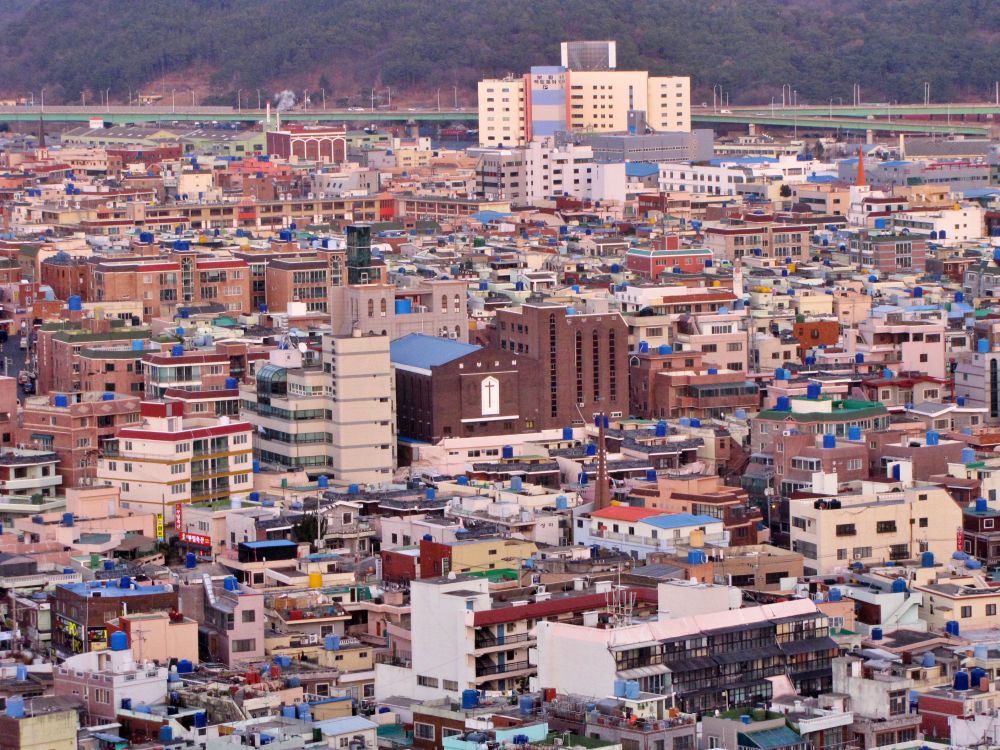 서3동에서 바라보면 저 멀리 왼쪽으로 보이는 곳이 서2동이다. 산중턱에 있는 아파트는 동남타워이다.
