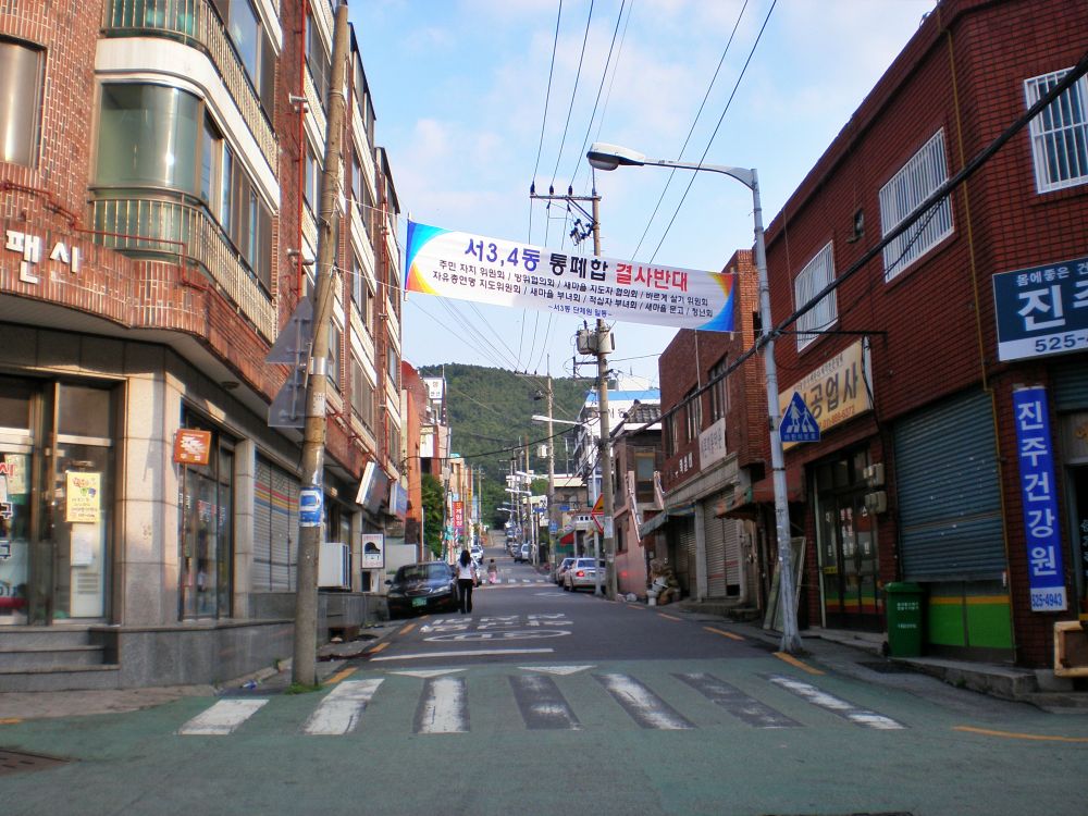 서동 부산은행 앞에서 바라본 서동 삼거리. 여기서 잘 보이지 않지만 뒷쪽으로 서2동 시실산 아래의 주택가가 보인다.