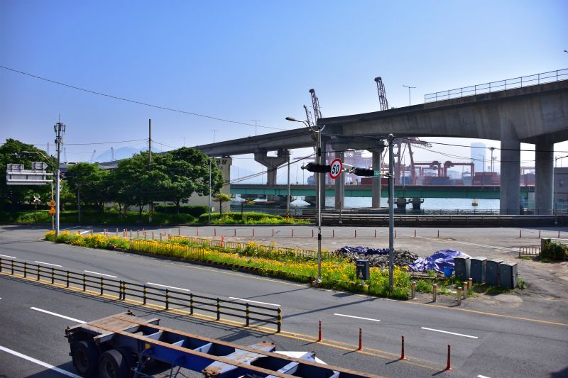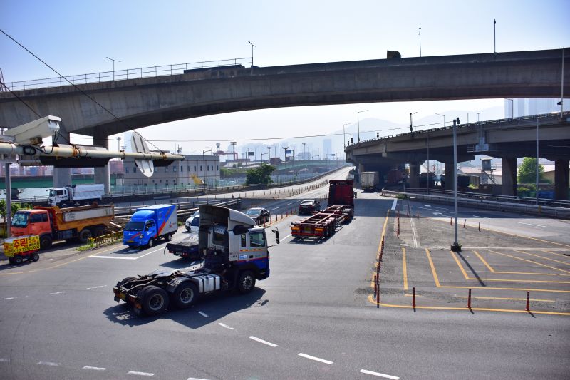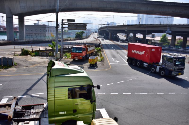 동천삼거리는 일반도로만 복잡하게 아니다. 이곳으로 번영로로 들어가는 총장고가로가 지나고, 그것을 가로질러 동서고가로가 지난다. 아래의 사진을 보면 가장 위가 동서가로이고, 아래가 충장고가로 이다. 사진에는 잘 보이지 않지만 맨 아래에 우암로가 동천삼거리를 향하고 있다.
