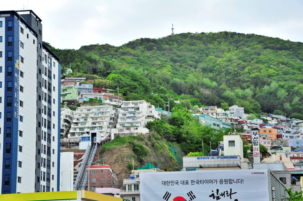 집 옆으로 산복도로 올라가는 엘리베이터가 설치 되어있다. 하지만 동천 주택 중간이나 동쪽에 사는 사람들은 그림의 떡이다. 그걸 타느니 차라리 걸어서 올라가는 것은 더 빠르다. 하지만 중간에서 내려다보니 멋지다. 저 멀리 아미동과 대신동도 보인다.