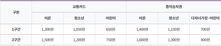 교통 카드카드 기준 1구간 성인은 1300원, 청소년은 1.050원, 어린이는 650원이다. 종이승차권은 어린이와 다자녀가정은 700원이며 나머지는 100이 더 비싸다. 2구간은 성인 기준 1500원이며, 종이승차권은 모두 100원 더 비싸다.