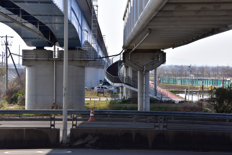 제방둑으로 가는 방법은 두 가지입니다. 도로 횡단보도를 이용해도 되고, 육교를 활용해도 됩니다.