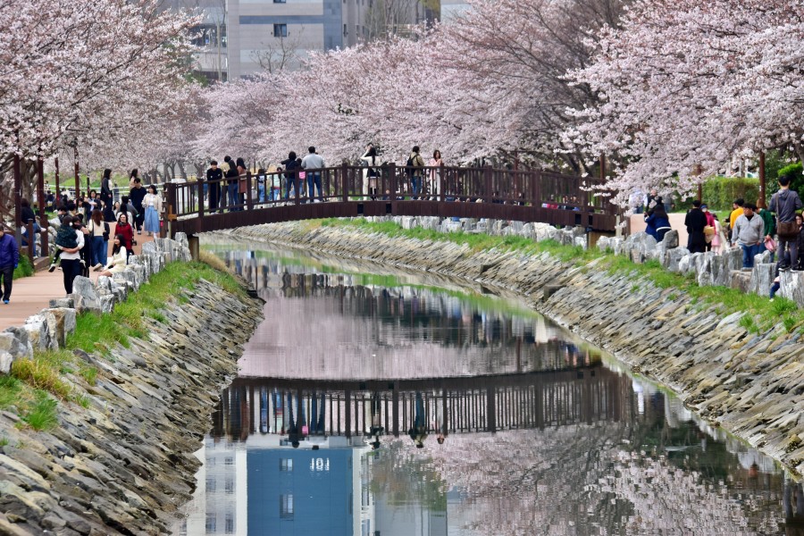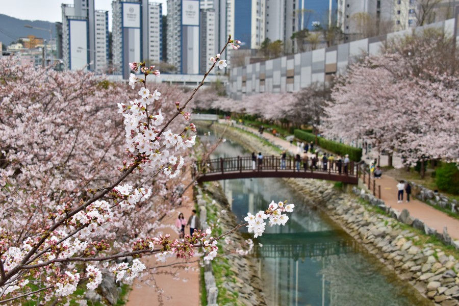 해경교차로에서 시작되어 해양대 입구 삼거리까지 이어지는 직선거리만 1km가 넘는 정말 긴 해수천이다. 이곳에 모두 벚꽃길이 조성되어 있어 정말 볼만하다.