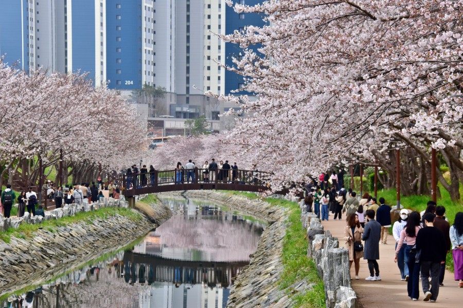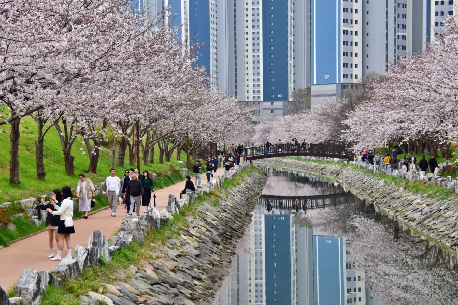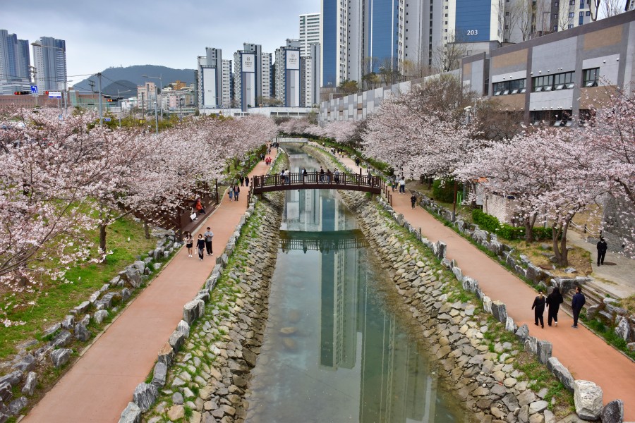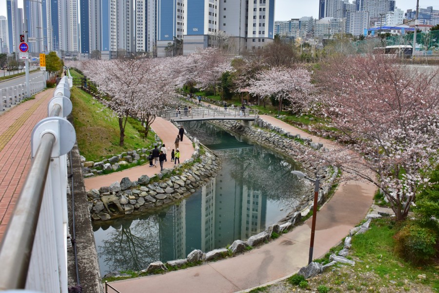 해경교차로에서 시작되어 해양대 입구 삼거리까지 이어지는 직선거리만 1km가 넘는 정말 긴 해수천이다. 이곳에 모두 벚꽃길이 조성되어 있어 정말 볼만하다.