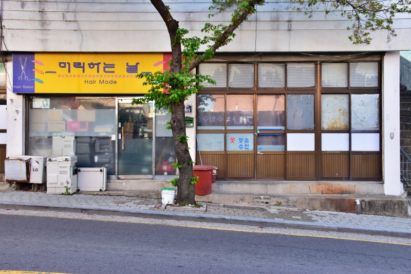 광명빌라를 지나 구봉마을 가까이 가면 활력이 확실히 떨어진다. 머리하는 날도 폐점이 디어 창고 사용되고 있다. 옆 옷 맞춤집도 간판을 내린 지 오래다. 많은 사람들이 저곳에 살았을 때 저 가게에 들러 머리도 하고, 옷도 수선했을 것이다. 하지만 사람들이 빠져 나가면서 가게들은 생계를 잇지 못해 하나둘씩 폐업하게 된다.