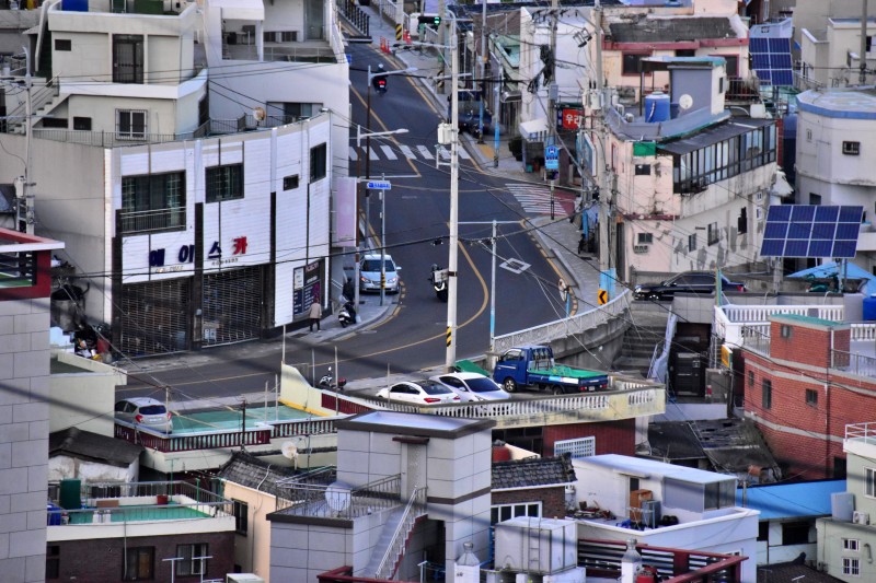 산복도로를 주차할 공간이 거의 없다. 그래서 도로와 연계된 주택 옥상을 주차장으로 사용한다. 그런데 차를 세우면 집이 안 무너지나? 괜한 걱정이다.