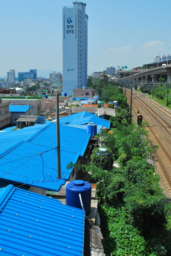 철길 아래 파란 지붕들이 디딤돌 마을이다. 철길마을은 이곳뿐 아니라 지금은 롯데 캐슬이 들어오면서 사라진 주례시장이 있던 곳도 철길마을에 속한다. 철길 주변에 만들어진 마을이라고 보면 된다. 하지만 이제는 주례2동만 남아있고, 나머지는 모두 개발되거나 철거되었다.