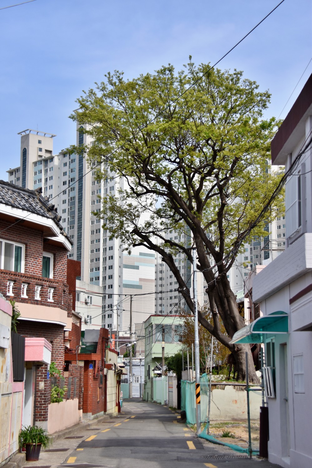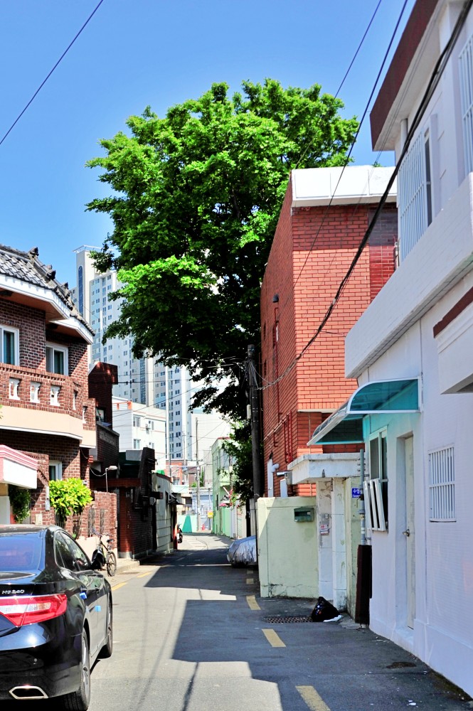 좁은 1차로 골목길에 주택 안에서 자라고 잇다. 크기가 커서 찾지 않아도 보일 정도이다.