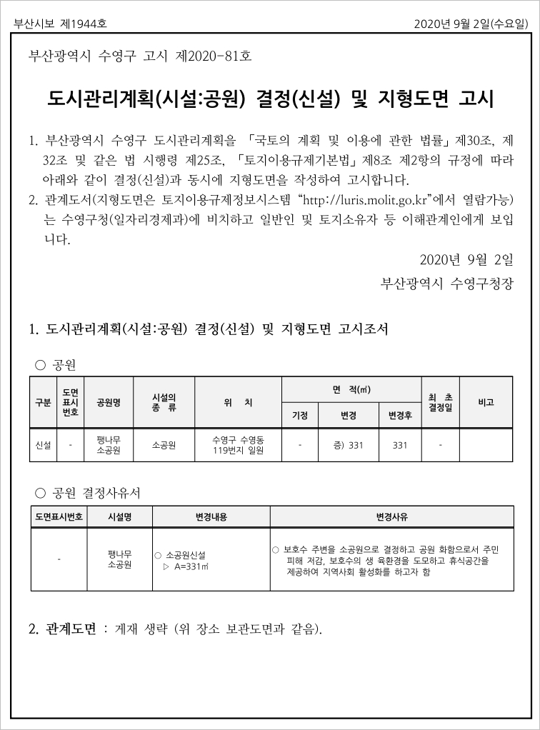 수영구는 2020년 9월 2일자로 팽나무가 이는 주택을 매입하고 팽나무소공원으로 조성하기로 결정한다.