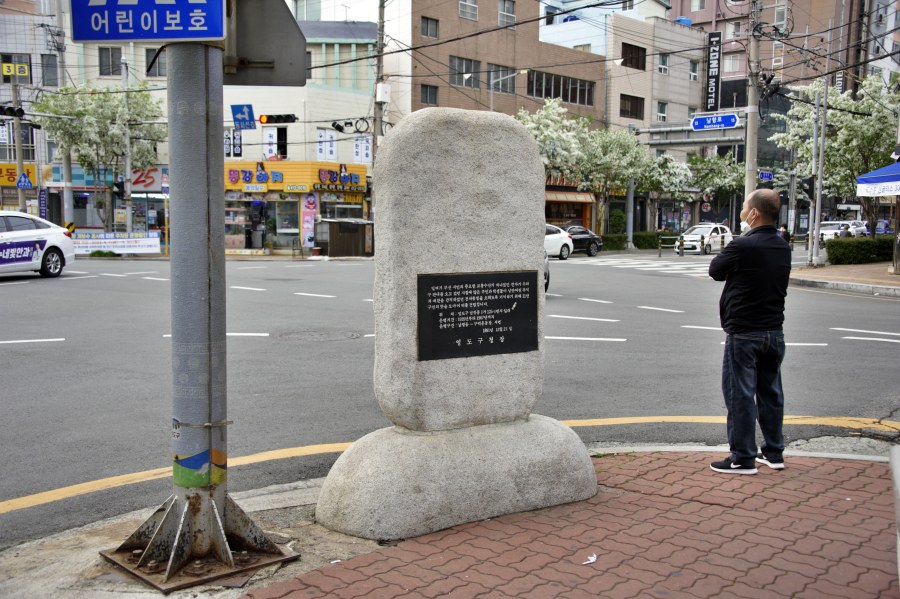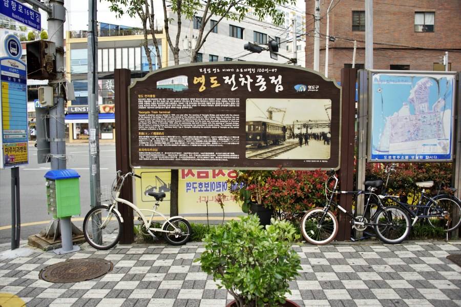 일제강점기 시절 영도는 섬이었지만 1934년 영도대교가 준공되면서 전차가 다니기 시작했다. 그전에는 목도선이 가갈치와 충무동 시장 쪽에서 주기적으로 오가면 영도 사람들의 발이 되어 주었다. 배로 다는 것과 다리가 생겨 걸어가는 것은 엄청난 차이가 있다. 전차까지 생겼으니 얼마나 좋았겠는가. 전차는 현재의 동삼동까지는 가지 않고 영도 대교 건너 바로 앞인 남항동 시장이 있는 곳까지 갔다. 그곳에 영도전차종점 기념비를 세웠다.