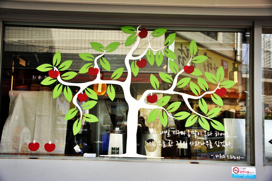 그날 많이 걸었다. 벌써 5 천보는 넘었을 것이다. 중간에 쉴 때가 된 것이다. 봉래시장 앞까지 왔다. 그러다 전통시장에 걸맞지 않은 카페 하나를 발견했다. 사과나무. 왜 뜬금없이 사과나무? 주인장이 사과나무를 좋아하는가?