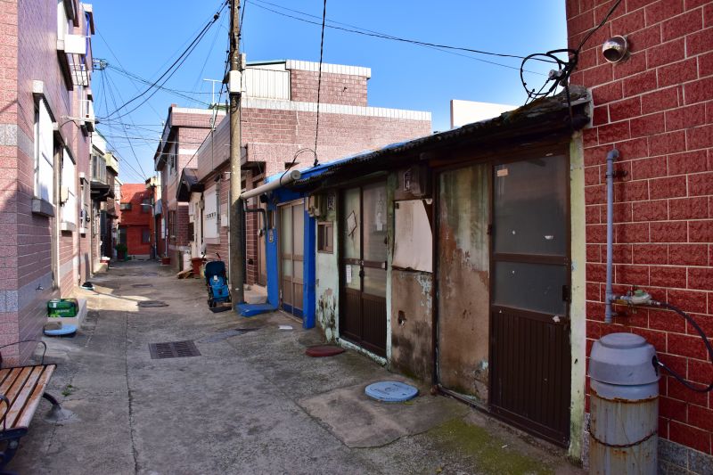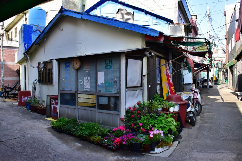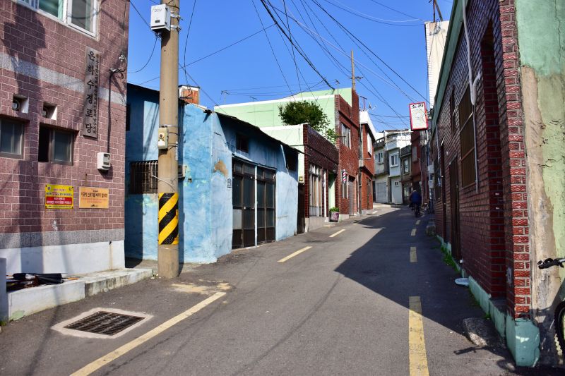 지금은 이렇게 좁은 길도 휑해 보이지만 4-50년 전에는 사람이 발 디딜 틈이 없었다고 한다. 출퇴근 시간이 되면 집들에서 나와 목재소로 진시장 근처에 있는 조선방직 등으로 일하러 나갔으니 얼마나 많은 사람들이 비좁을 골목을 다녔을까?