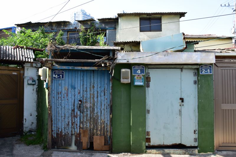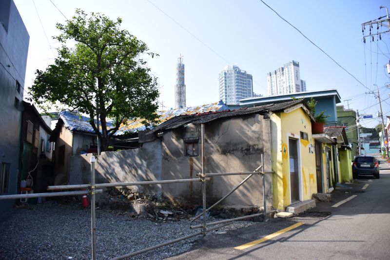 엷은 시멘트가 벗겨지면 여지없이 흙으로 된 속살이 드러난다. 이곳의 상당수의 집들이 이런 형태이다. 이런 형태의 집들은 대부분 피난 와서 이곳에 땅을 받고 스스로 집을 지어 올린 사람들의 집이다.