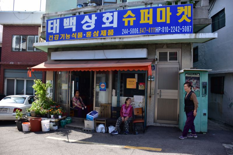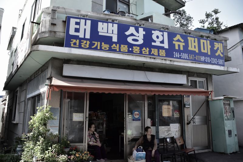 태백상회 앞. 할머니들과 30분이 넘도로 대화를 나누었다. 지난 과거의 이야기들을 털어놓으셨다. 삶아온 삶이 애잔하다. 사진을 찍겠다 부끄러워하면서 괜찮다고 한다.