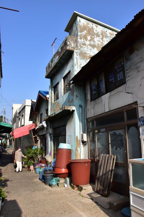 지금은 이렇게 좁은 길도 휑해 보이지만 4-50년 전에는 사람이 발 디딜 틈이 없었다고 한다. 출퇴근 시간이 되면 집들에서 나와 목재소로 진시장 근처에 있는 조선방직 등으로 일하러 나갔으니 얼마나 많은 사람들이 비좁을 골목을 다녔을까?