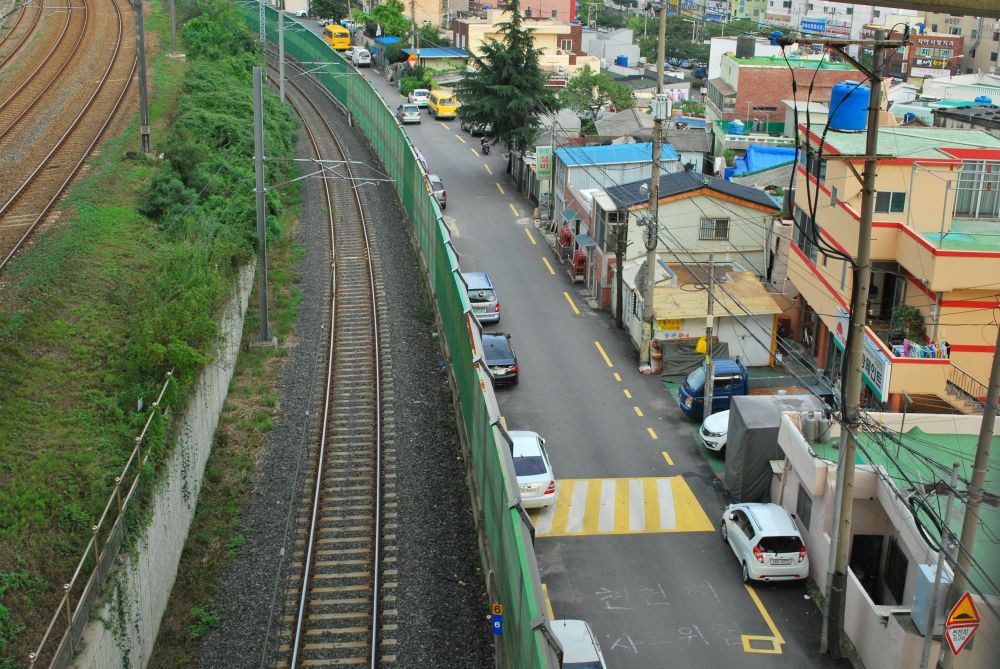 경부선 철길. 아래로는 주례삼거리가 있고, 위로는 온골마을이 자리한다.