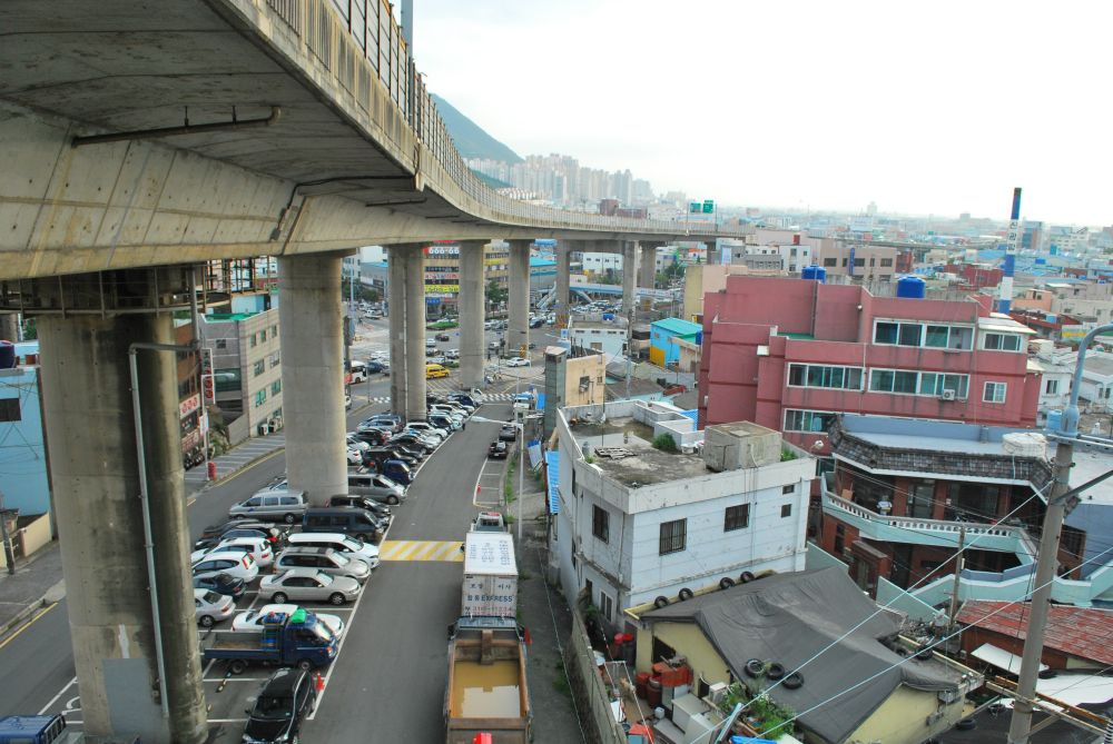 철길 위에서 바라본 주례사거리. 동서고가 도로는 주례동을 가로질러 진양삼거리로 향한다.