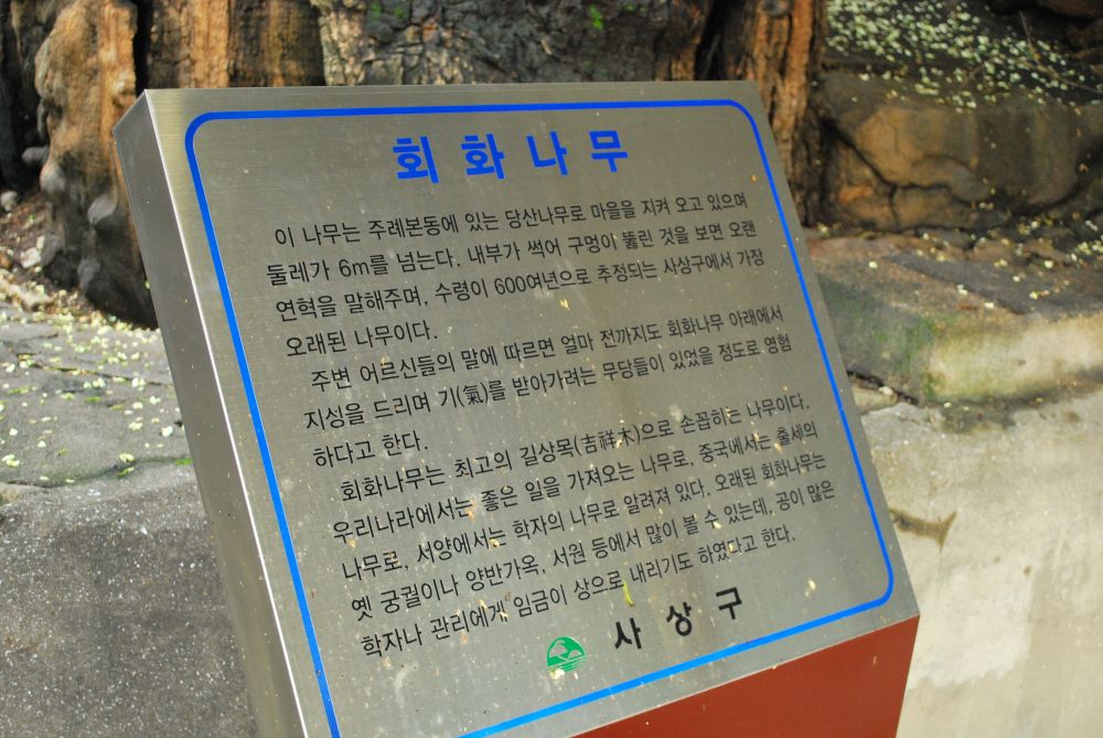 주례시장 안에는 우물이 있었고, 우물 곁에 거대한 회화 나무가 있었다. 수령은 약 600년 정도 되었다고 한다. 주례동의 회화나무는 신령해서 당골레들이 와서 굿을 하고 힘을 받아 갔다고 한다. 일 년에 몇 번씩 회화나무 앞에서 굿을 했다.