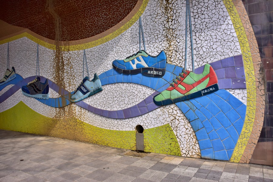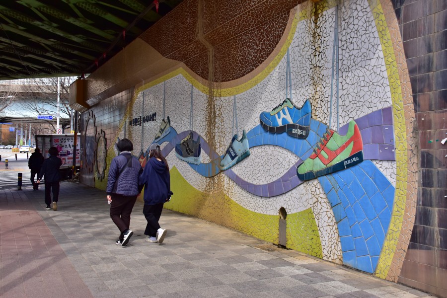 철길 아래에는 그동안 만들어진 신발의 브랜드가 모자이크로 그려져 있다. 프로월드컵, 프로스펙스 등 다양한 신발 메이커가 그려져 있다.
