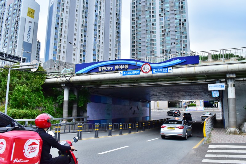 터널을 지나 나와 뒤돌아보니 은근 복잡해 보인다. 출퇴근 시간에는 이곳이 정말 번작합니다. 터늘은 하나인데 주변에서 거대한 아파트 단지들이 들어서면서 교통 지옥이 되고 말았다. 이곳에 다른 곳을 이용하면 길이 너무 복잡해지기 때문에 해운대나 반여동 등지고 가는 차량들이 이곳에서 만나 엉키고 설킨다.
